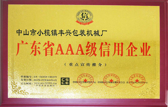 企業(yè)信用與企業(yè)發(fā)展緊密相連,公司歷來重視信用建設(shè),一貫秉承“誠信服務(wù)”的理念,公司一直履行與客戶、員工以及社會(huì)約定的職責(zé)。中國質(zhì)量品牌網(wǎng)、中國質(zhì)量信用調(diào)查測(cè)評(píng)聯(lián)合會(huì)、北京中標(biāo)評(píng)信用評(píng)價(jià)中心聯(lián)合工作組對(duì)公司的實(shí)力、人力資源管理、資質(zhì)認(rèn)證、品牌建設(shè)、技術(shù)研發(fā)能力、售后服務(wù)、產(chǎn)品和采購、營銷管理、賬款管理、信用風(fēng)險(xiǎn)管理、歷史評(píng)級(jí)和履約狀況、社會(huì)信用記錄及財(cái)務(wù)報(bào)表等方面的信用狀況及信用能力進(jìn)行了綜合性調(diào)查評(píng)審,認(rèn)為中山市小欖鎮(zhèn)豐興包裝機(jī)械廠完全達(dá)標(biāo),特別頒發(fā)了AAA級(jí)企業(yè)信用重點(diǎn)宣傳推介的證書。