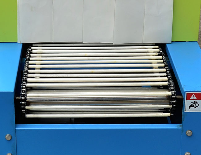 因此對鏈式輸送帶結構,主要針對產(chǎn)品比較重的、大件的物品作熱收縮包裝。對于一些圓柱形物品,借助兩根滾針的間隔距離托住,能夠讓產(chǎn)品隨著滾針運行而滾動,收縮膜受熱更均勻;平放在上面的被收縮產(chǎn)品,也可以隨著滾針的滾動運行而產(chǎn)生推動前移,減少了滾針接觸面留下印痕現(xiàn)象。整體收縮效果實現(xiàn)平整、光滑。(注:對于通用的熱收縮包裝機,太重的產(chǎn)品很難實現(xiàn)滾針推動和平移的效果)。