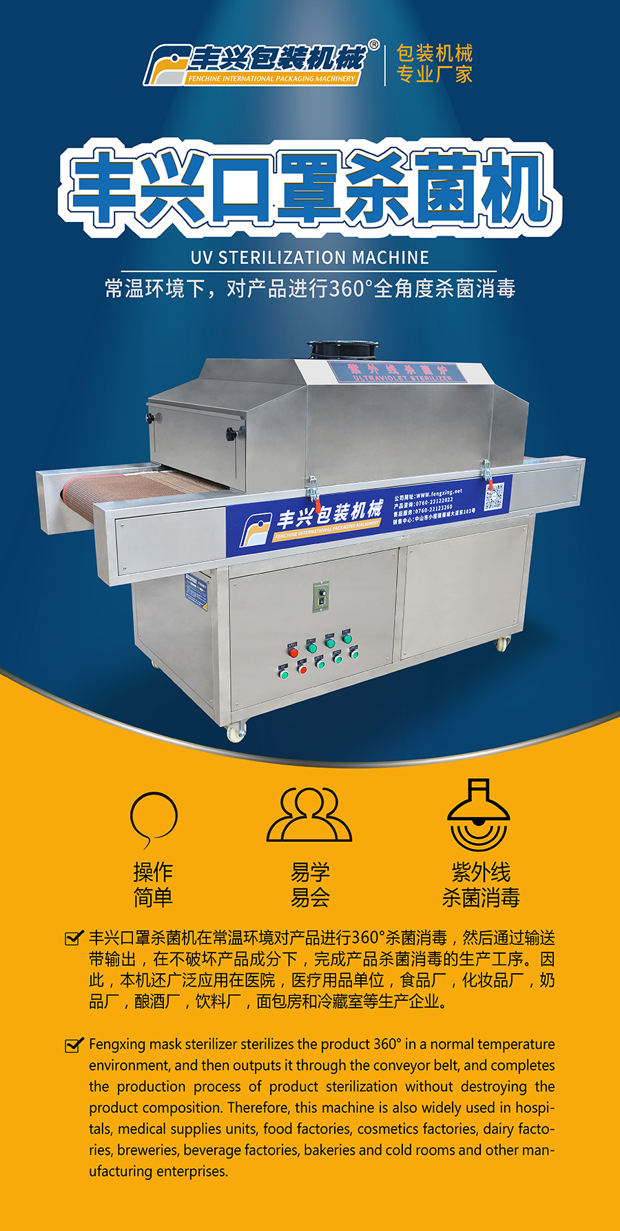 豐興口罩殺菌機是根據紫外線殺菌的科學原理而研發(fā)設計生產的一款口罩殺菌消毒的機器,本機通過輸送帶把產品帶入殺菌爐內,在常溫環(huán)境對產品進行360°殺菌消毒,然后通過輸送帶輸出,在不破壞產品成分下,完成產品殺菌消毒的生產工序。因此,本機還廣泛應用在醫(yī)院,醫(yī)療用品單位,食品廠,化妝品廠,奶品廠,釀酒廠,飲料廠,面包房和冷藏室等生產企業(yè)。