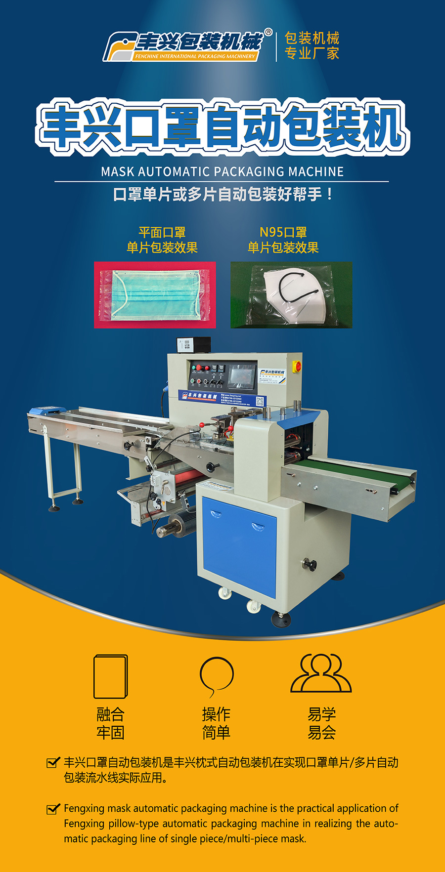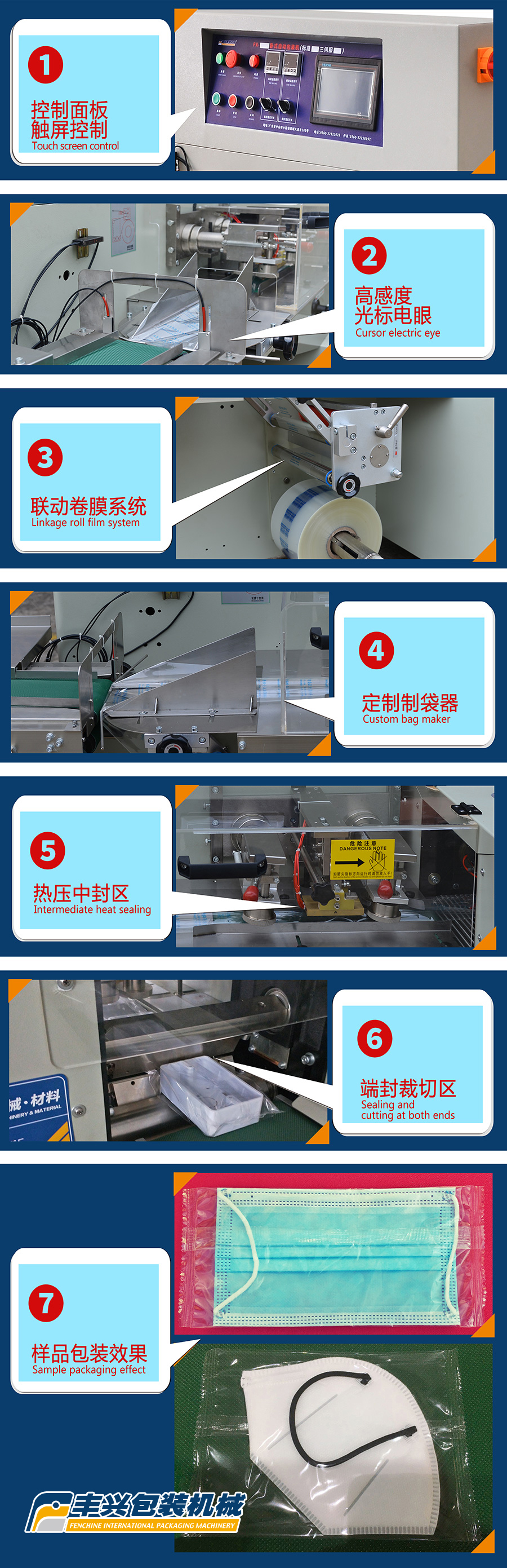 豐興口罩自動(dòng)包裝機(jī)是豐興枕式自動(dòng)包裝機(jī)在實(shí)現(xiàn)口罩單片/多片自動(dòng)包裝流水線實(shí)際應(yīng)用。本機(jī)通過輸送帶把口罩自動(dòng)帶入包裝膜,自動(dòng)按預(yù)設(shè)參數(shù),連續(xù)滾動(dòng)進(jìn)行制袋,密封,封切,輸出等包裝過程。廣泛適用于:食品,冷凍食品,冷飲,飲料,五金,塑性材料,日用品,紡織品,酒店用品,配件,玩具,家電,開關(guān)面板,插座等等各行業(yè)。