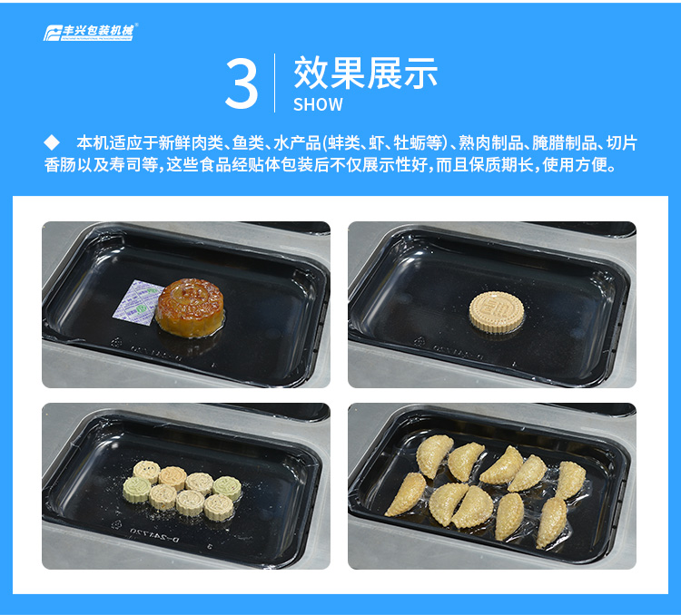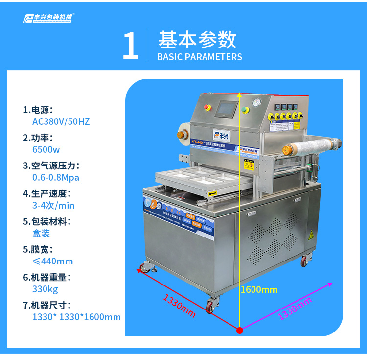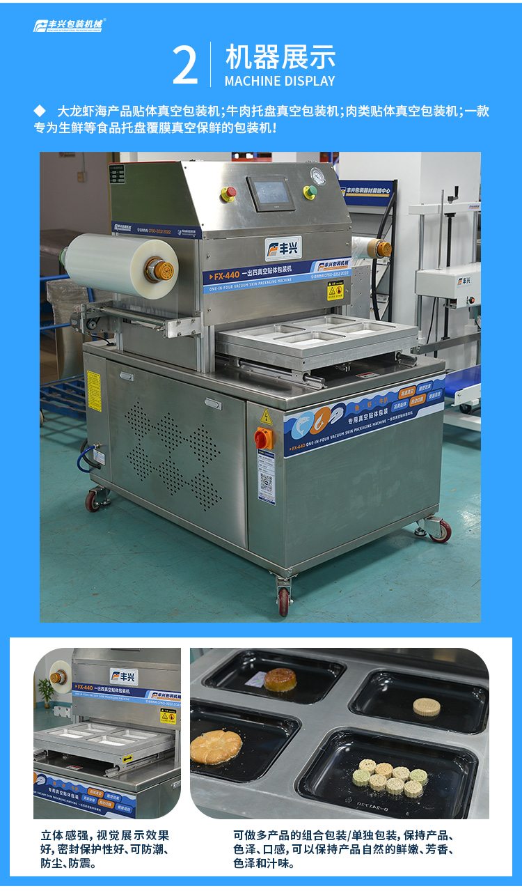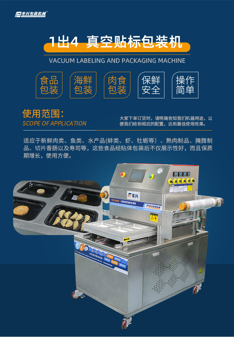 訂購(gòu)熱線:0760-22122022FX-440一出四真空貼標(biāo)包裝機(jī),是一款專為食品貼體膜包裝而研發(fā)生產(chǎn)的食品托盤真空貼體包裝機(jī),本機(jī)是通過(guò)對(duì)貼體膜進(jìn)行加熱,同時(shí)配以真空泵進(jìn)行抽真空,將膜緊貼到產(chǎn)品和托盤上,適應(yīng)于新鮮肉類、魚(yú)類、水產(chǎn)品(蚌類、蝦、牡蠣等)、熟肉制品、腌臘制品、切片香腸以及壽司等,這些食品經(jīng)貼體包裝后不僅展示性好,而且保質(zhì)期長(zhǎng),使用方便。歡迎大家咨詢!