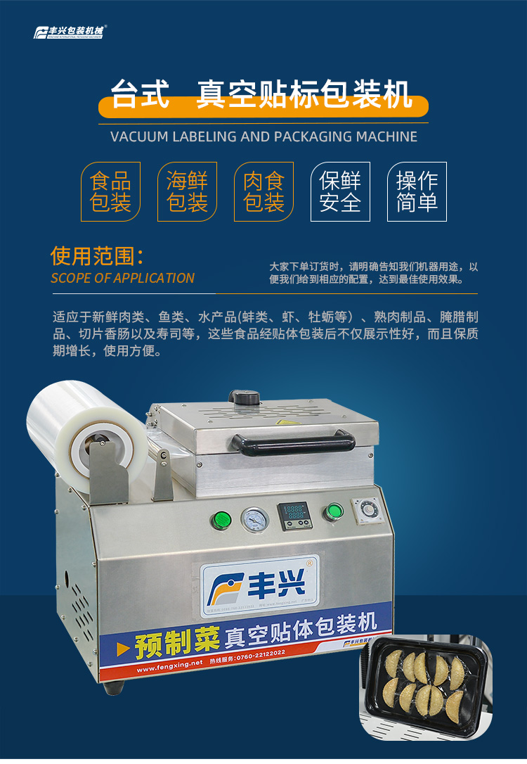 訂購熱線:0760-22122022FX-240T臺(tái)式真空貼標(biāo)包裝機(jī),原理是采用低溫復(fù)合膜,將物料放在下模板的托盒或膜上,在真空狀態(tài)下利用真空吸力將透明貼體包裝膜順應(yīng)產(chǎn)品形狀覆蓋在產(chǎn)品表面及塑料托盤上,適應(yīng)于新鮮肉類、魚類、水產(chǎn)品(蚌類、蝦、牡蠣等)、熟肉制品、腌臘制品、切片香腸以及壽司等;包裝具有使食品保鮮、保質(zhì)、保色、保型、保味的特點(diǎn);這些食品經(jīng)貼體包裝后不僅展示性好,而且保質(zhì)期長(zhǎng),使用方便。歡迎大家咨詢!