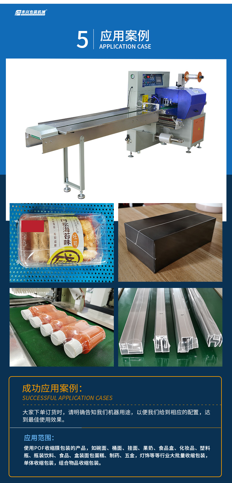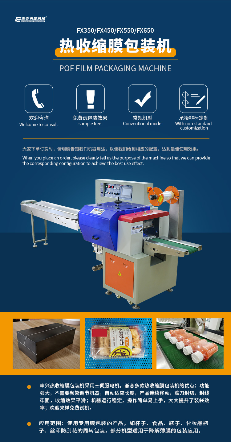 熱收縮膜枕式包裝機采用三伺服電機,兼容多款熱收縮膜包裝機的優(yōu)點,性能穩(wěn)定,操作簡單易上手,提升包裝產(chǎn)品裝袋效率;自動化程度高,可以自動識別產(chǎn)品長度,無需人工測量和設置參數(shù),一步到位、省時省膜,輕松完成熱收縮膜包裝,包裝后的產(chǎn)品封合線牢固,收縮效果平滑貼合;是企業(yè)熱收縮包裝的好幫手。
