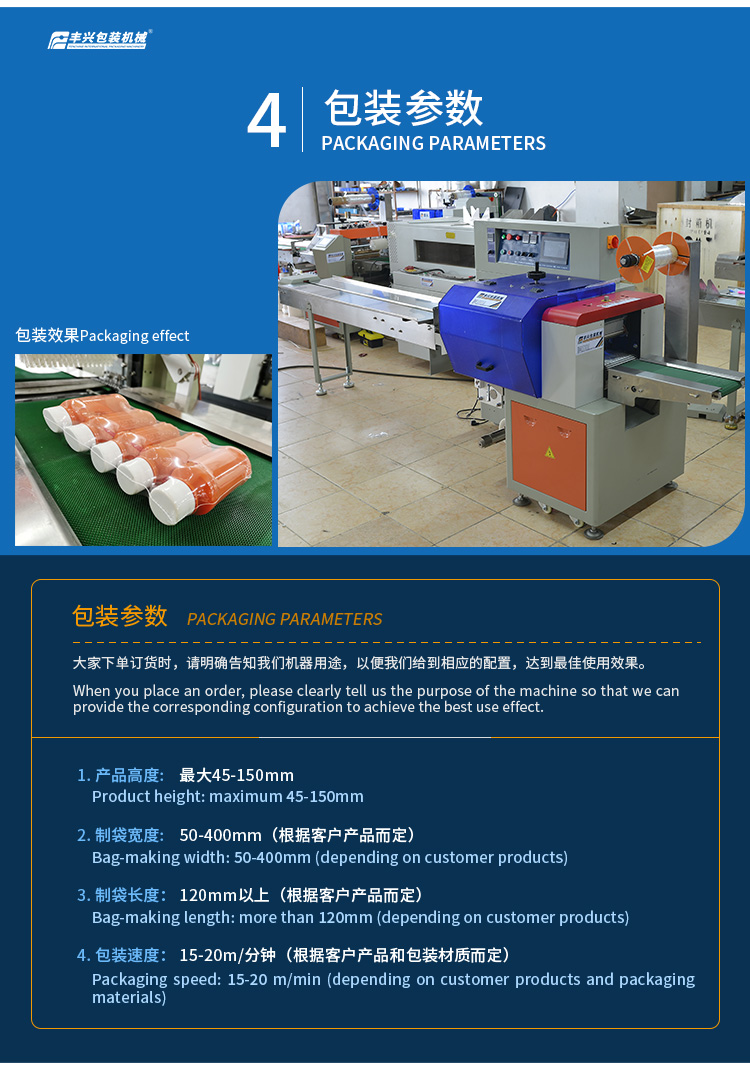 9. 包裝速度: 15-20m/分鐘(根據(jù)客戶產(chǎn)品和包裝材質(zhì)而定)